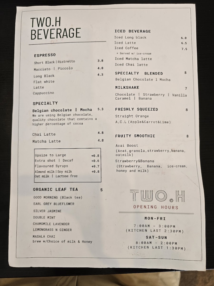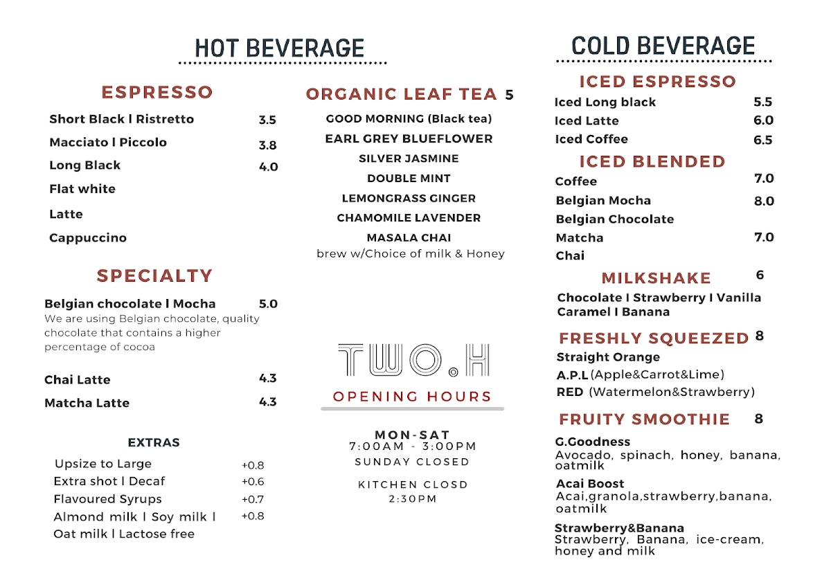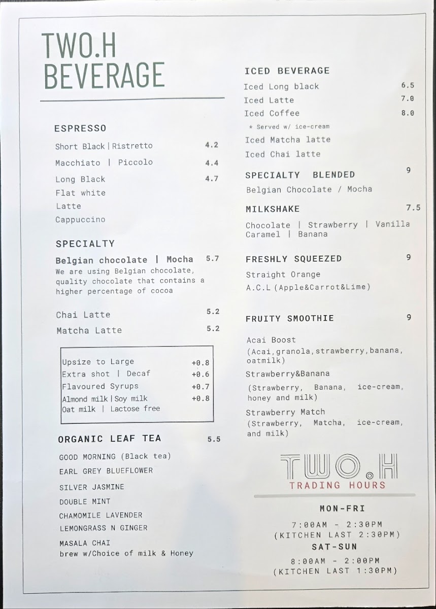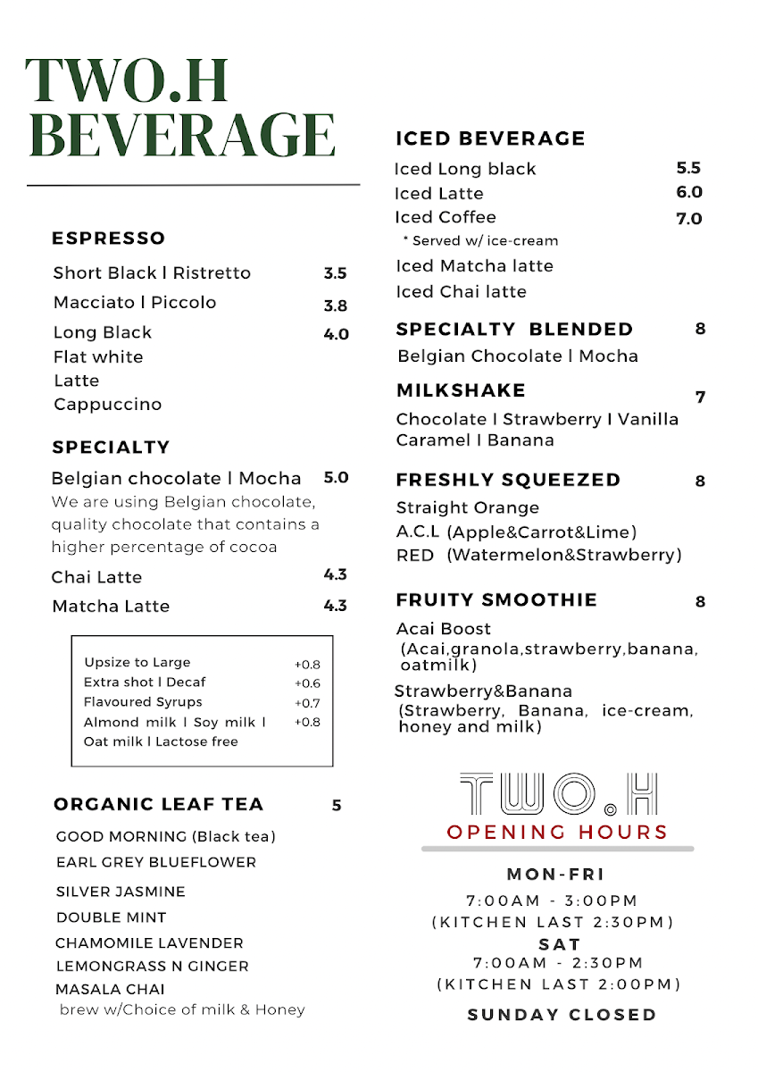 TWO.H cafe Menu